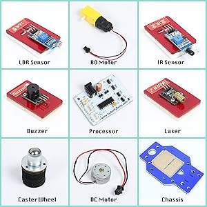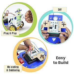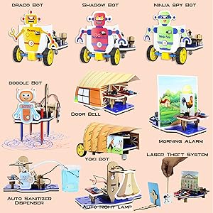 - u2b50 u3010WHAT YOU GETu3011 : 50+ parts including sensors. processor brain. motors. wheels. cables connecting wires. LED’s. pump. and top-up materials without the need for soldering. tools. or coding skills. Kids may use their ideas and creativity to build ten various types of building robots. like the Ninja Spy Bot. Doodle Bot. Shadow Bot. Yoki Bot. Bank Anti theft Sensor. and many more.