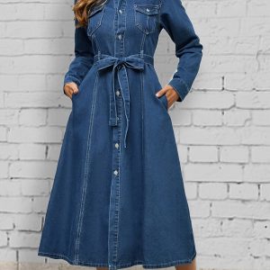 Stylish Long Sleeve Denim Dress – Breathable, Elegant, and Fitted with Flap Pocket, Lace-Up Closure, and Ball Gown Hem – Perfect for Spring and Fall Seasons