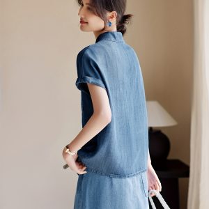 XWI Elegant Women’s Lyocell Denim Shirt – Summer Chic Breathable Denim Top with Lapel Collar, Non-Stretch, Solid Color, Regular Short Sleeve, Button Detail, Woven Fabric – Stylish Workwear Essential