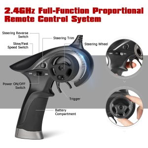 - 2.4GHz full-function proportional radio control system suffices a stable control range within 280 feet. Reliable transmission forward. brake and reverse would never fail. Splash waterproof electronic components make a all-terrain vehicle out of this truck. No worries to run this remote control cars on grassland . sands. and bumpy grounds.