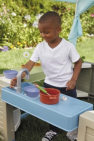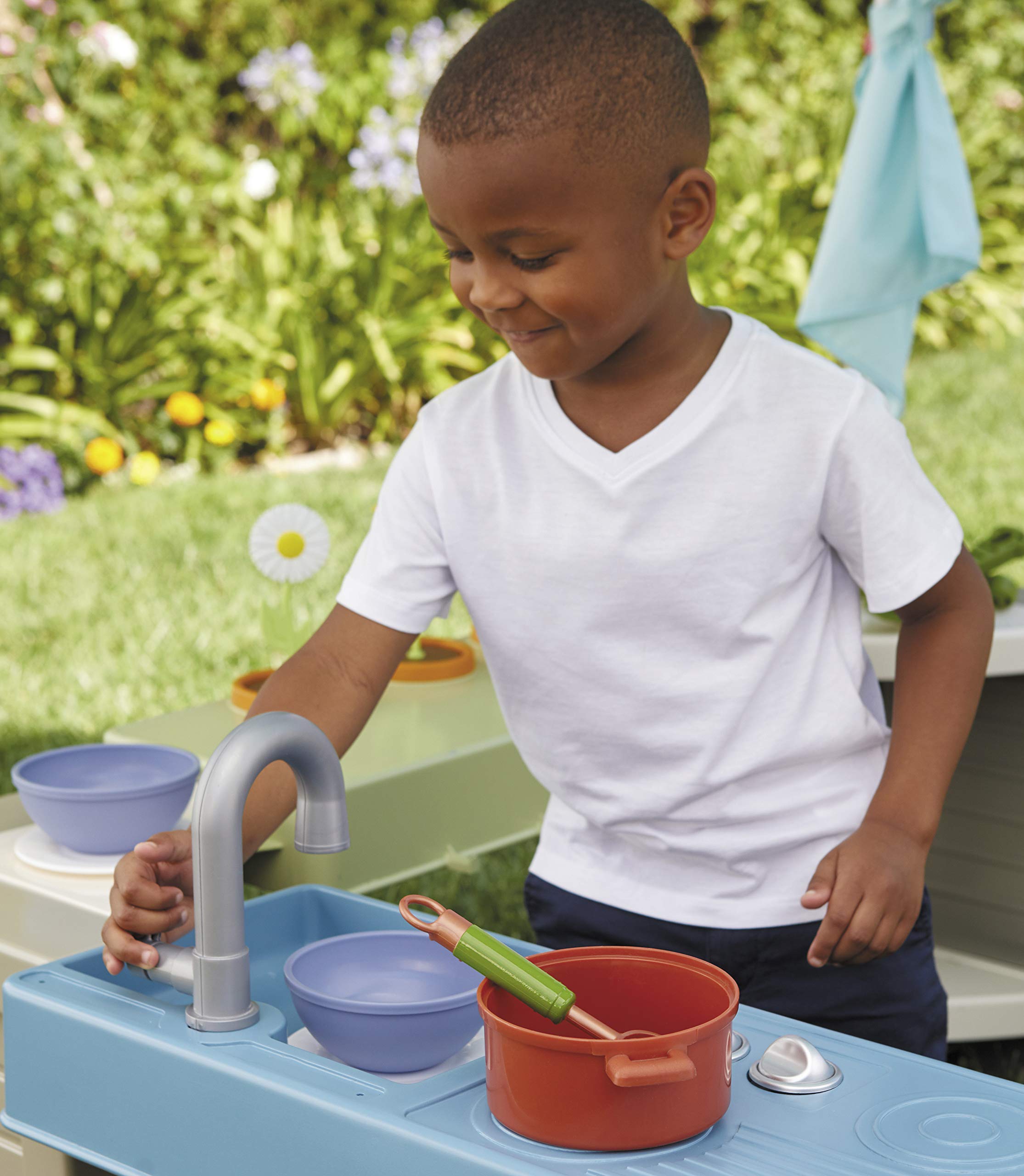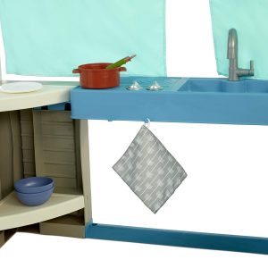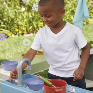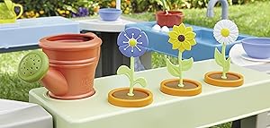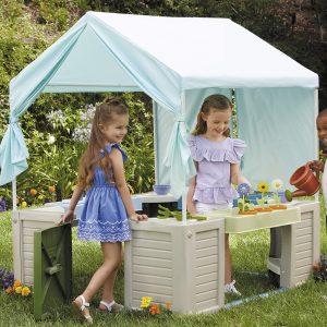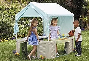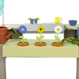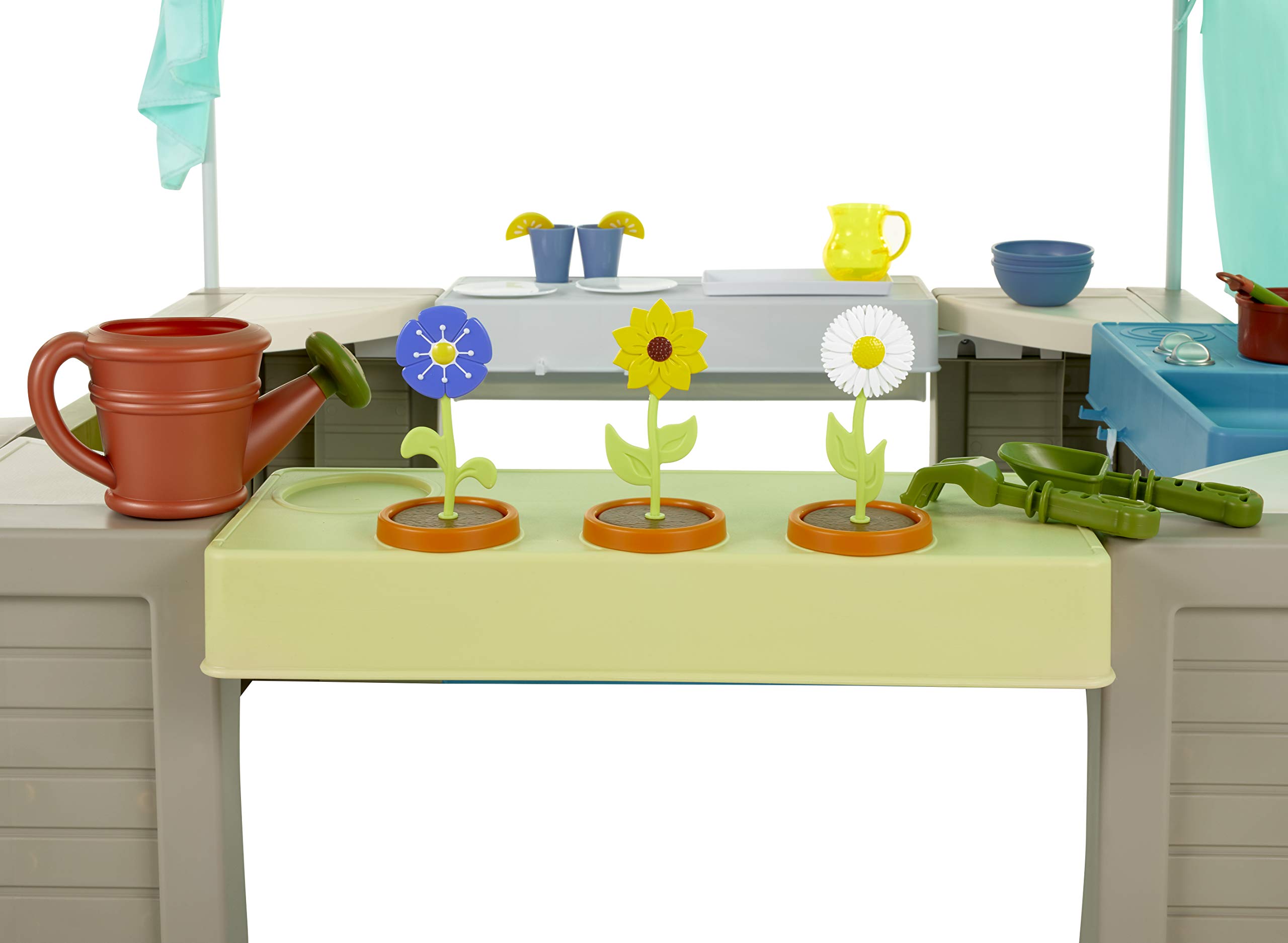 - 3 ROLEPLAY STATIONS. Three roleplay stations: kitchenette with pretend stove and sink. lemonade stand with real chalkboard. and gardening station with pretend flowers