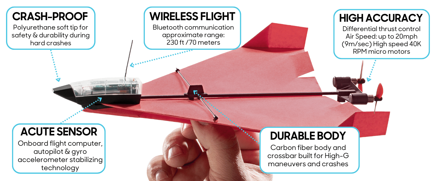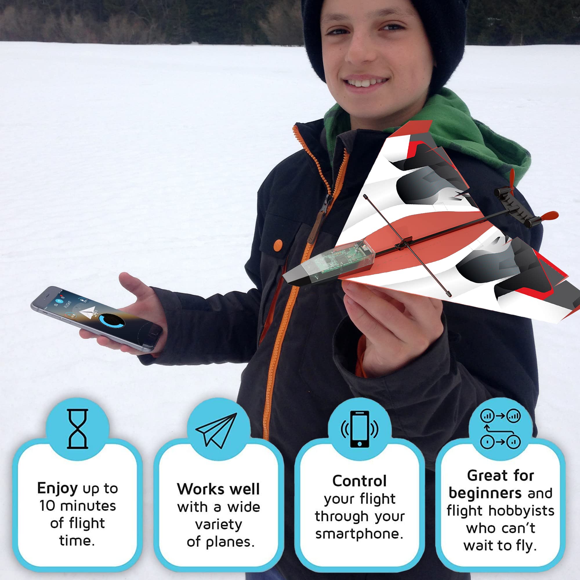 - PILOTED FLIGHT – Grab a sheet of paper. fold it. and go! Instantly put yourself in the cockpit of an amazing smartphone controlled paper airplane that does high speed tricks. The bluetooth module. which includes autopilot control. connects to your phone so you can experience the sensation of flying countless paper. foam. and even Balsa Wood airplane models.