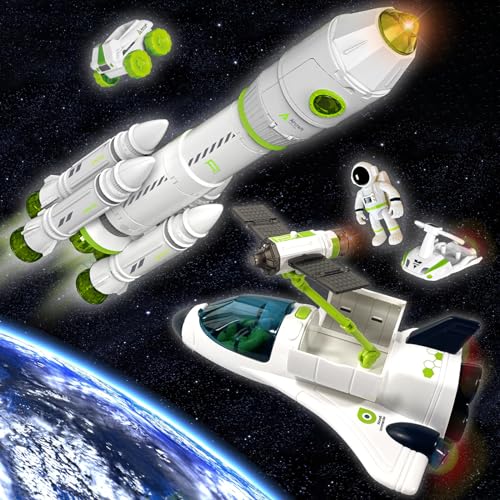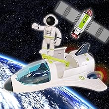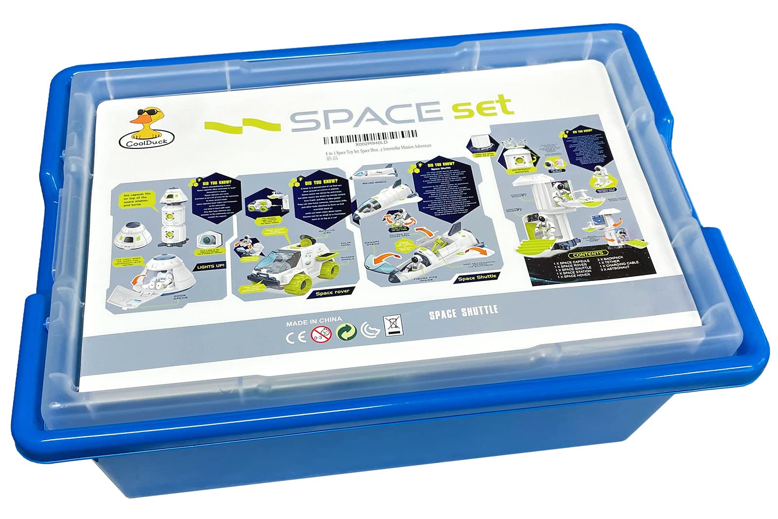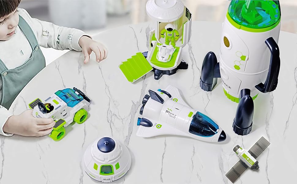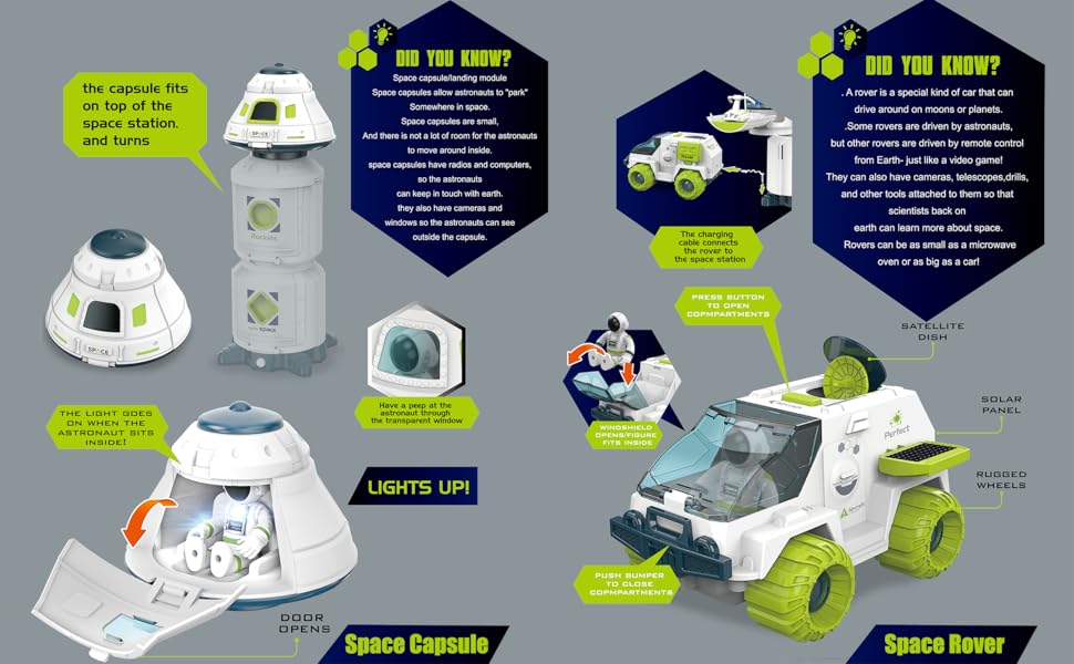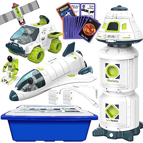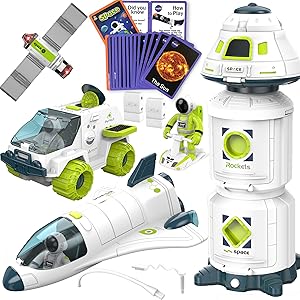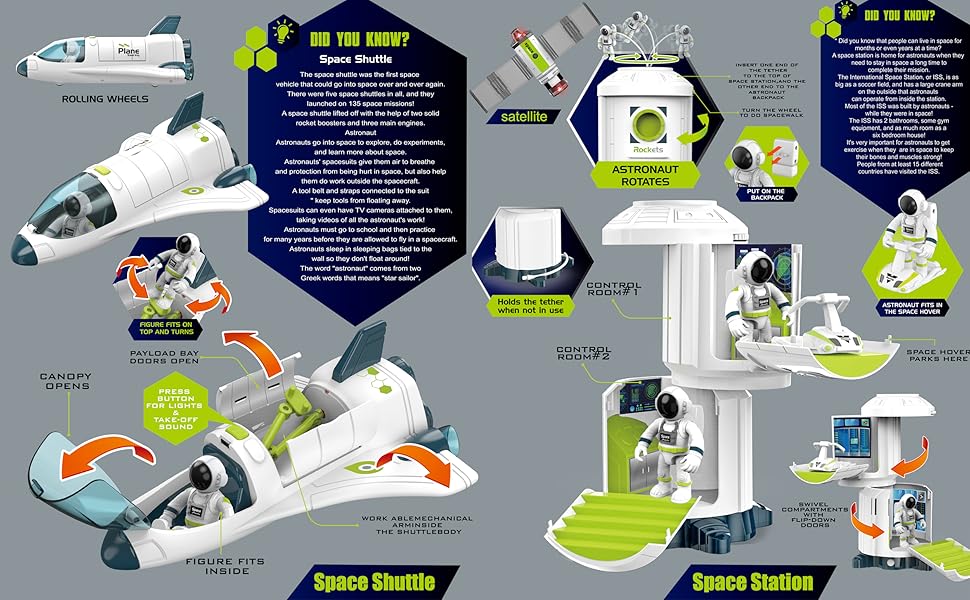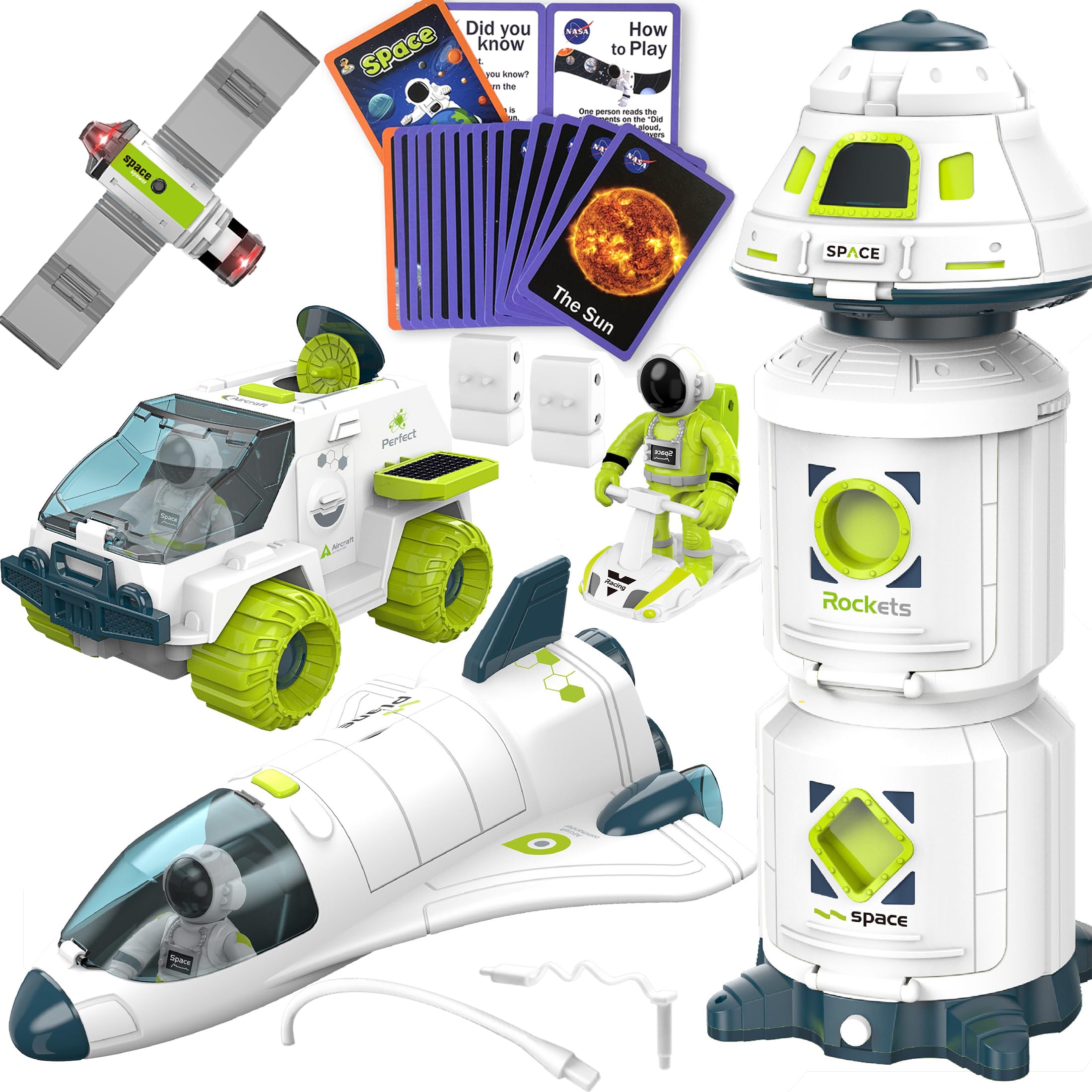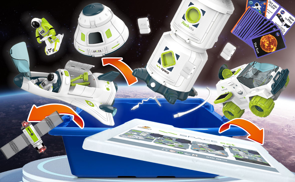 - This playset includes the space shuttle & satellite. space rover. space station. space capsule. and 17 Flash Cards for Space Knowledge Education Games.